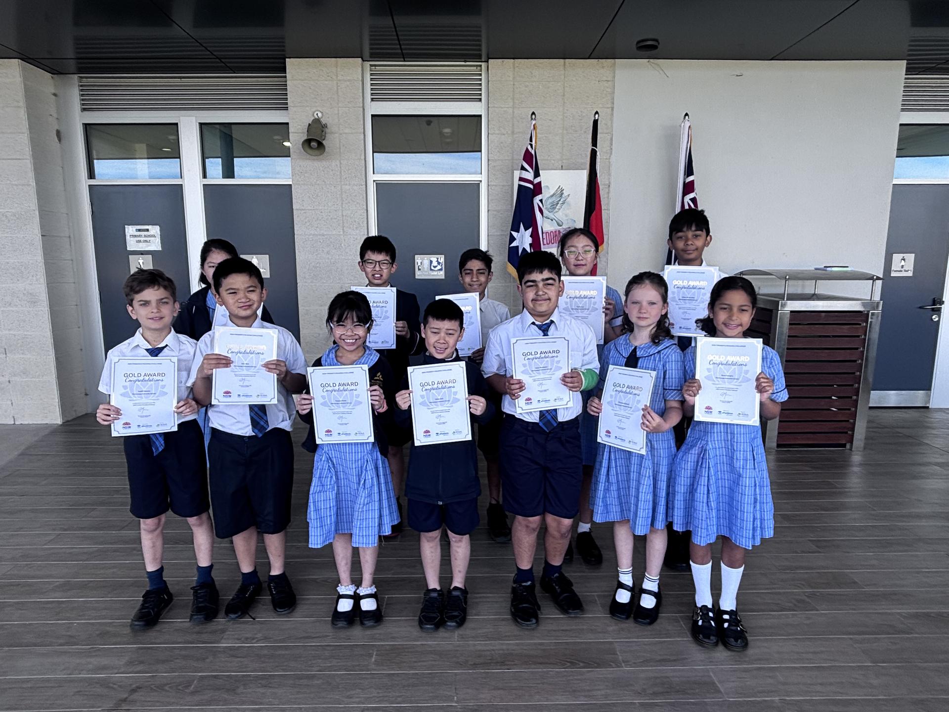 Gold (Completed the PRC 4 times): Mila A (3K), Isaac B (3K), Florence B (3J), Ethan K (3K), Hosana K (3K), Neo M (3J), Judah P (3J), Sana S (3J), Adam A (5C), Emma L (5C), Vihaan S (5L), Lambert T (5C), Chloe Z (5C), Thomas B (6Q), Aimee D (6Q), Hunter H (6Q), and Madeleine J (6Q).